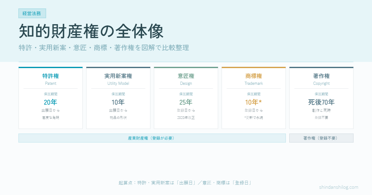 知的財産権の全体像|特許・商標・著作権・意匠を図解で比較整理